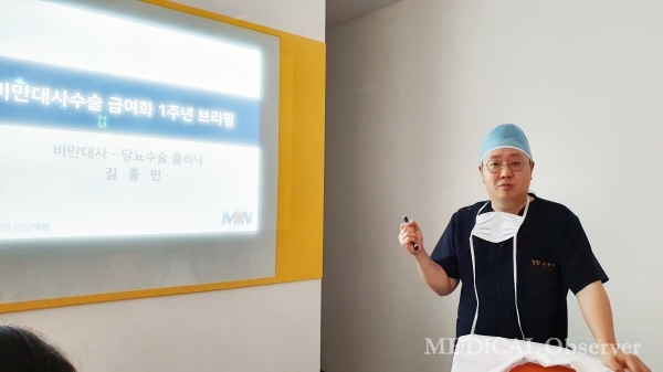 민병원 김종민 병원장, 수술 대상자 및 복원술 등 급여기준 개선 필요성 강조 민병원 김종민 병원장은 최근 기자들과 만난 자리에서 비만대사수술 급여화 1년이 지난 만큼 급여기준의 변화가 필요하다고 강조했다. [메디칼업저버 양영구 기자] 비만대사수술이 급여화된 지 1년이 지난 가운데 의료계 일각에서 급여기준 개선이 필요하다는 주장이 나온다. 현재 운영되는 급여기준에서 비만대사수술 대상 환자의 폭을 넓히는 한편, 요양급여가 적용되는 복원술의 기준을 명확히 해야 한다는 주장이다. 민병원 김종민 병원장은 최근 기자들과 만난 자리에서 이 같이 역설했다. 비만대사수술, 뚜렷한 효과 비만대사수술에 따른 환자 아웃컴은 건강보험 급여화의 정당성에 힘을 싣는 결과를 가져왔다. 김 병원장에 따르면 비만대사수술을 받은 환자의 결과를 분석한 결과, 체중은 물론 동반한 당뇨병도 개선됐다. 실제 민병원에서 비만대사수술을 받은 환자의 경우 여성이 62.1%(남자 37.9%)로 주를 이뤘다. 특히 비만대사수술을 받은 환자들은 당뇨 개선 결과가 확연했다. 환자 중 당뇨병 동반 환자는 77.8%였는데, 이들 중 비만대사수술 후 인슐린 투여를 중단하고 1~2종류의 경구용 항당뇨병제로 한 환자는 100%였다. 또 경구용 당뇨병 치료제를 복용하는 환자의 경우 82%가 약을 중단했다. 김 병원장은 "비만대사수술을 위해 병원을 찾는 환자의 경우 연령이 40대 미만은 비만 때문에, 40대 이상은 당뇨 때문이었다"며 "젊은 연령층의 경우 당뇨의 근본적인 치료를 목적으로 의료기관을 찾고 있다"고 설명했다. 급여 1년...급여기준 필요성↑ 이날 김 병원장은 비만대사수술의 급여기준이 개선돼야 한다고 강조했다. 비만대사수술이 당뇨 치료에 긍정적인 영향을 미치는 것으로 나타난 만큼 급여 기준을 확대하고 세부적으로 해야 한다는 것이다. 우선 비만대사수술 급여를 받을 수 있는 대상자 확대를 언급했다. 현 급여기준에 따르면 비만대사수술 대상자는 BMI 35kg/㎡ 이상이거나, BMI 30kg/㎡ 이상이면서 고혈압 등 합병증을 동반한 경우를 급여로 인정한다. 또 기존 내과적 치료나 생활습관 개선으로 혈당이 조절되지 않는 BMI 27.5kg/㎡ 이상~30kg/㎡ 미만의 제2형 당뇨병 환자에게 위소매절제술 및 비절제 루와이형 문합 위우회술을 시행하는 경우다. 김 병원장은 "BMI 27.5 kg/㎡ 이상부터 급여를 적용한 건 좋지만, 위소매절제술과 비절제 루와이형 문합 위우회술만 급여로 인정한 것은 한계"라며 "국내 당뇨 환자와 다른 인종과의 췌장 기능에 대한 엄밀한 평가가 필요하다. 한국 당뇨 환자에 대한 비만대사수술은 루와이형 문합 위우회술보다 위소매절제술을 기반으로 한 우회술이 최적화돼 있다"고 말했다. 김 병원장은 "동양인처럼 췌장 기능이 서양인에 비해 낮은 경우 위소매절제술로는 부족한 만큼 우회를 접목해야 효과를 유지할 수 있다"고 강조했다. 위밴드술을 시행받은 환자의 복원과 관련한 급여기준도 바뀌어야 한다고 했다. 현재 복원술의 경우 비만수술 후 급성기 합병증을 동반한 경우를 급여로 인정하고 있다. 급여기준에서 합병증이라고만 명시할 게 아니라 보다 구체적으로 적시해야 한다는 지적이다. 김 병원장은 "위밴드는 시간이 지나면 밴드가 파고드는 등 합병증이 발생하지만, 환자에게 심각한 위해를 가할 경우에만 급여로 인정하고 있어 개선이 필요하다"며 "특히 복원술의 경우 개복의 여지가 있음에도 불구하고 복강경을 사용해야만 급여로 인정하고 있어 급여기준의 범위를 넓혀야 한다"고 주장했다. 이어 "다양한 수술법을 시행할 수 있는 의료기관이 늘어나야 한다"며 "한국형 제2형 당뇨병 최적의 수술법을 찾기 위해 여러 의료기관의 지표가 모인 빅데이터도 필요하다"고 말했다. 한편, 김 병원장은 향후 비만대사수술에 따른 호르몬 변화에 대한 연구를 진행, 논문으로 발표할 계획이다. 출처 : 메디칼업저버(http://www.monews.co.kr)