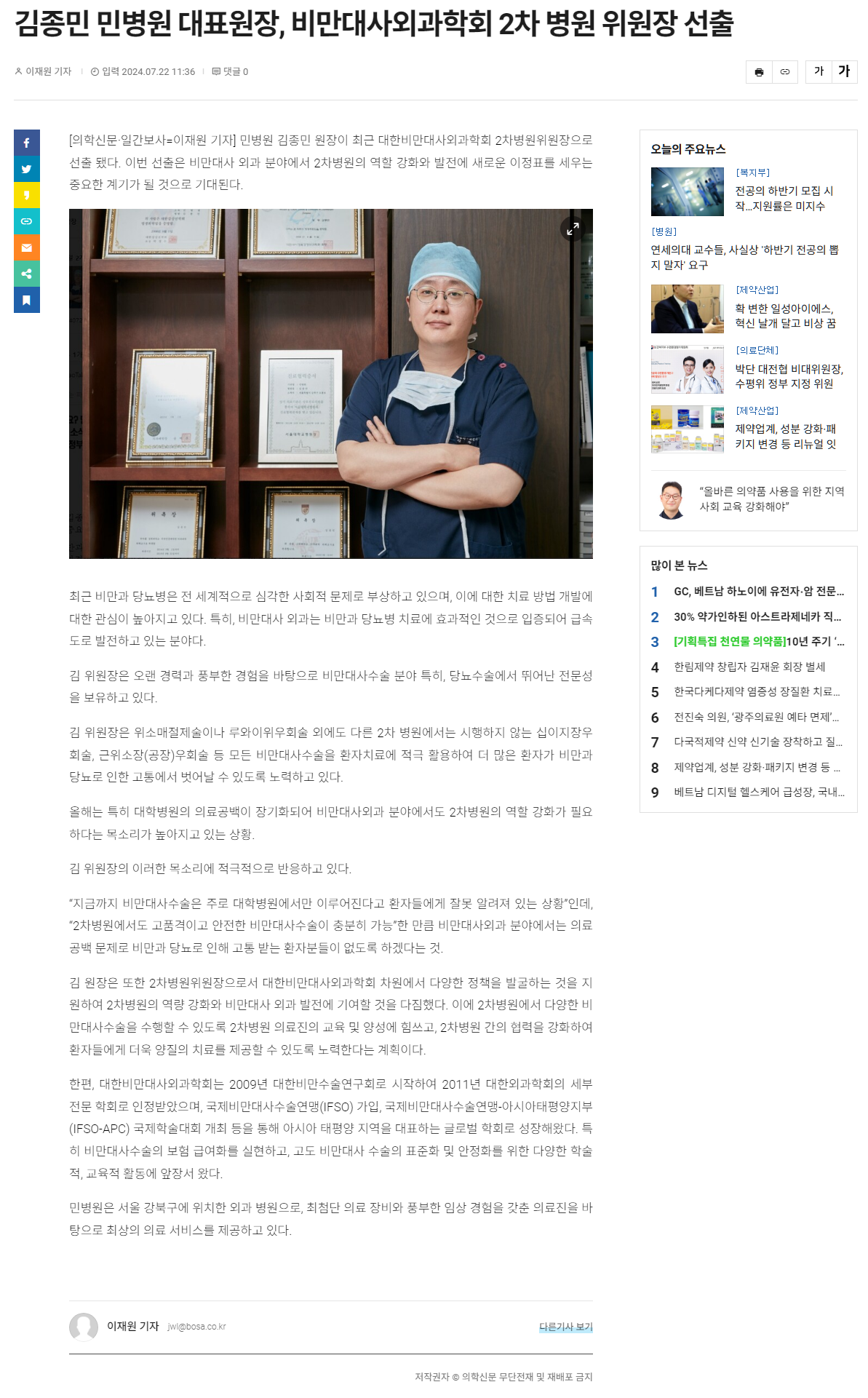 [의학신문] 김종민 민병원 대표원장, 비만대사외과학회 2차 병원 위원장 선출 2024-07-22 hit.334 |