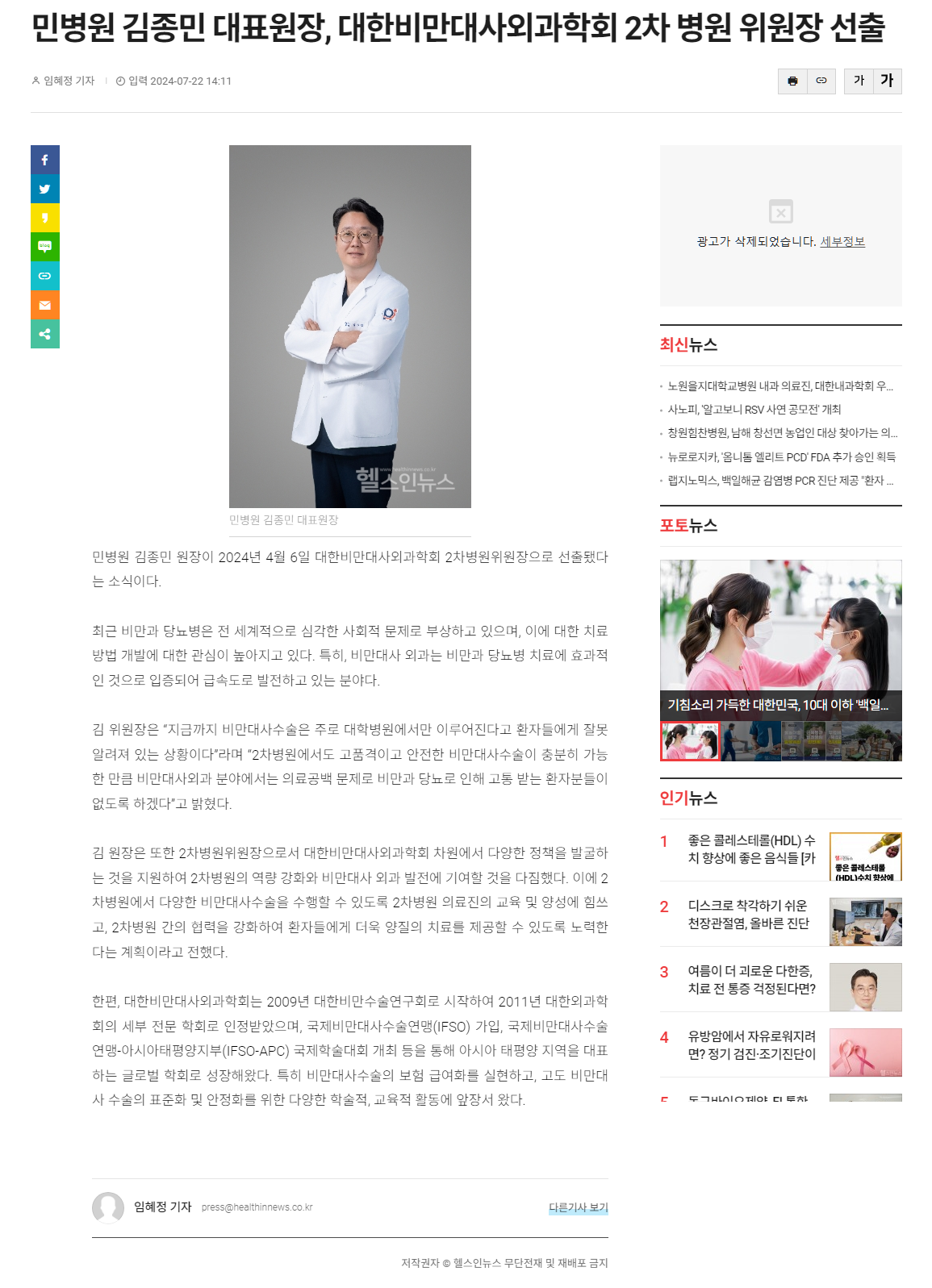 [헬스인뉴스] 민병원 김종민 대표원장, 대한비만대사외과학회 2차병원 위원장 선출 2024-07-22 hit.366 |